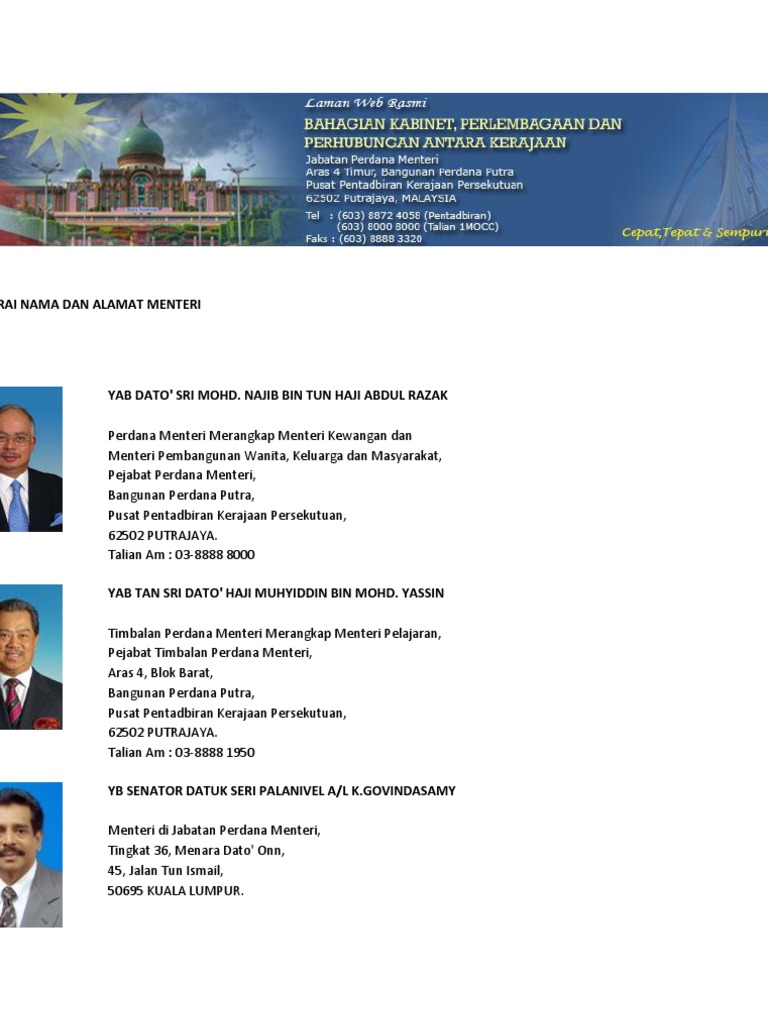 Drjeffrey 03 8891 7002 drjeffrey 03 8891 7002. Timbalan menteri di jabatan perdana menteri hal ehwal agama jabatan perdana menteri aras 9 blok a kompleks islam putrajaya no 23 jalan tunku abdul rahman presint 3 pusat pentadbiran kerajaan persekutuan 62100 putrajaya. Nama jawatan telefon e mel jpm gov my. Setia perdana 8 kompleks setia perdana pusat pentadbiran kerajaan persekutuan 62502 putrajaya malaysia.