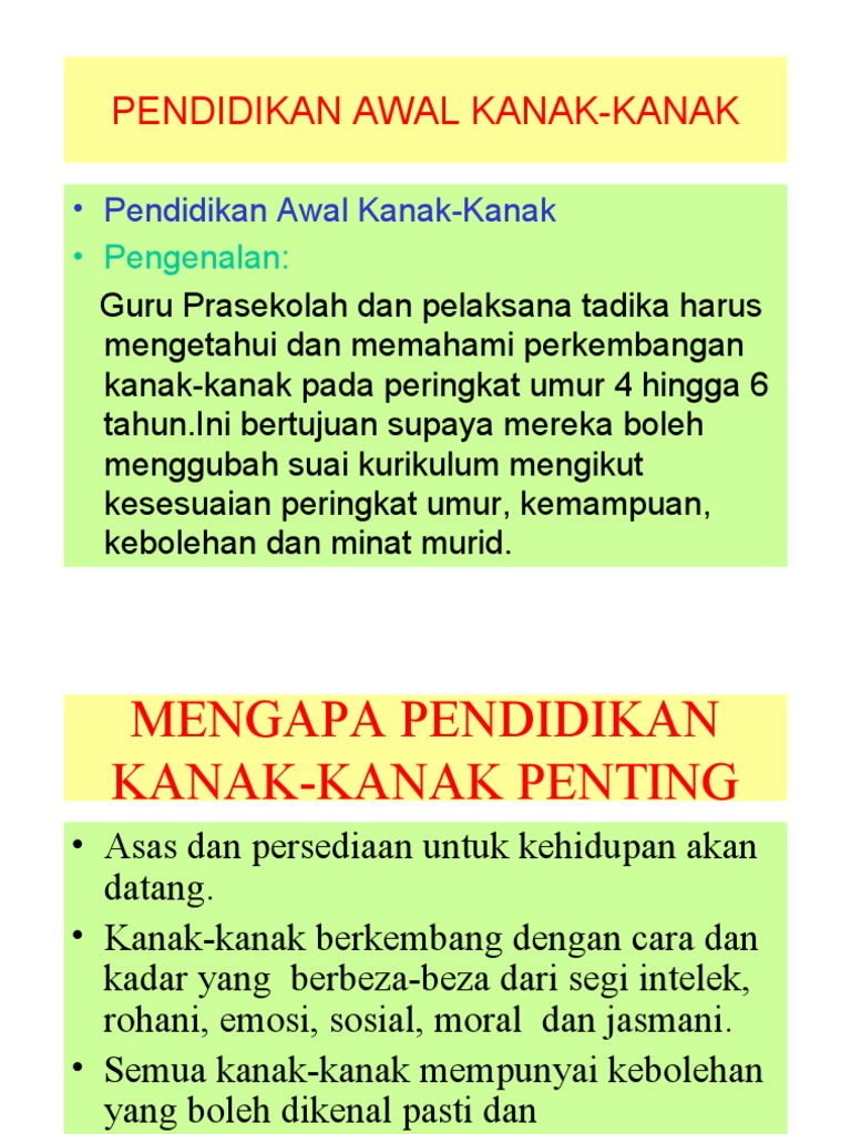Apa itu pendidikan awal kanak kanak. Falsafah pendidikan awal kanak kanak pakk perkembangan maksimum otak yang berkaitan dengan deria dan bahasa berlaku semasa kanak kanak menjangkaui tahun pertama usianya. Menurut swiniarski breitborde dan murphy 1999 takrif penjagaan dan pendidikan awal kanak kanak berbeza di seluruh dunia. Dalam akta pendidikan 1996 akta 550 menyatakan pendidikan prasekolah preschool education bermaksud program pendidikan untuk kanak kanak berumur dari empat hingga enam tahun tadika kindergarten bermaksud tempat di mana menempatkan sejumlah kanak kanak pendidikan prasekolah seramai sepuluh atau lebih manakala taska nursery merujuk kepada akta taman asuhan kanak kanak 1984 akta 308. Pendidikan awal merupakan kunci kejayaan mereka dalam membina satu kehidupan.