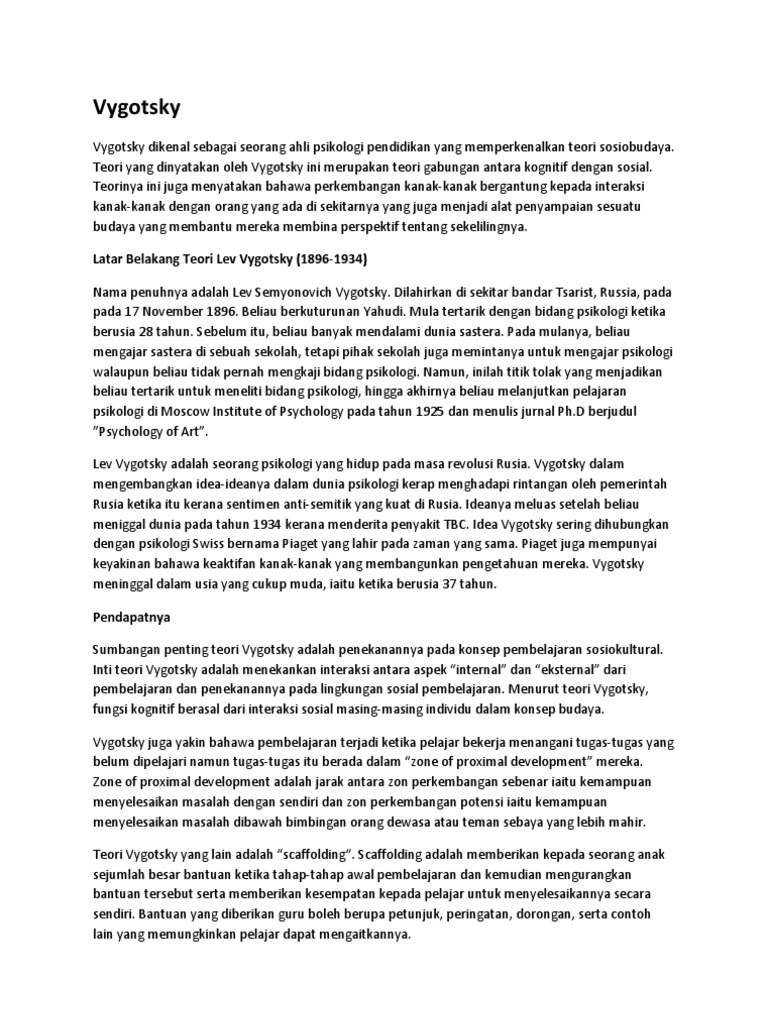 Pendidikan awal kanak kanak di malaysia sebelum kemerdekaan merupakan pendidikan tidak formal dan lebih kepada pendidikan agama dan bukan formal. Menurut vygotsky dalam trianto 2010. Konsep scaffolding membawa maksud suatu bantuan atau bimbingan kepada pelajar bagi menyiapkan sesuatu tugasan yang tidak dapat diselesaikan tanpa mendapat bantuan daripada guru. Pentaksiran kanak kanak ini perlu dilakukan secara berterusan dan konsisten bagi mendapatkan maklumat yang sahih dan tepat.