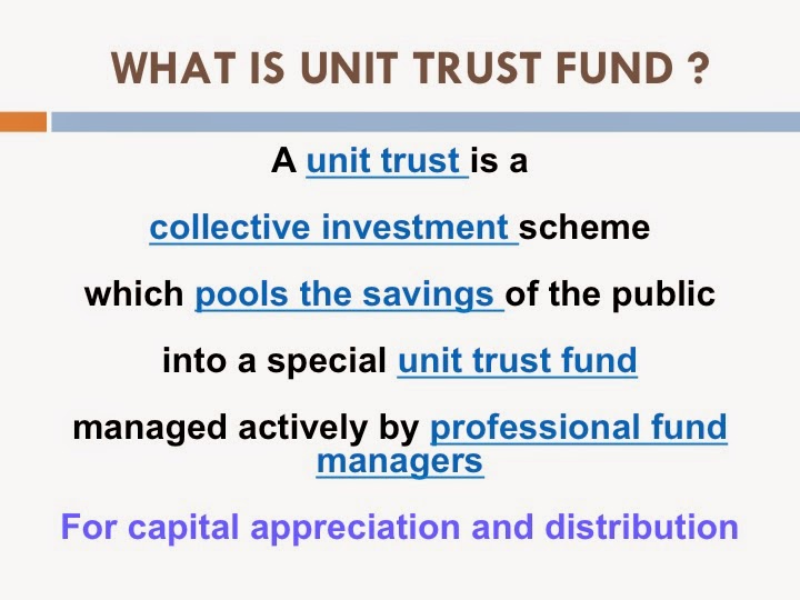 Di malaysia istilah unit trust lebih popular daripada unit amanah. Unit trust unit amanah. Secara umum unit trust ada 3 objektif. Unit trust adalah satu bentuk pelaburan yang dikumpulkan dari ramai pelabur pool investment dan membenarkan mereka yang dari kelompok yang mempunyai matlamat yang sama untuk melabur wang mereka ke portfolio securities atau lain lain aset yang diuruskan secara professionals.