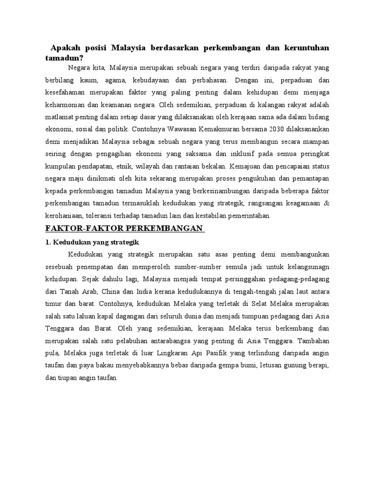 Apakah posisi malaysia berdasarkan perkembangan dan keruntuhan tamadun. Tamadun dan pembangunan berkembang pesat manakala rakyat mencapai tahap kemajuan dan keintelektualan yang tinggi hidup menjadi senang lenang dan mewah namun nilai kekuatan dan perpaduan semakin kurang dan terhakis dalam diri anggota masyarakat walaupun masih ada lagi nilai nilai patriotisme. Rakyat malaysia yang hidup bersatu padu telah mencapai kemajuan dalam bidang politik ekonomi dan sosial. Bidang ketenteraan kelemahan disiplin dalam kalangan pegawai atasan banyak rasuah dan penjualan jawatan penghapusan aristokrasi tentera lama 2. Oleh itu anda dapat lihat keempat empat sumber sesebuah tamadun iaitu kebendaan akal fikiran kerohanian dan wahyu telah menjadi sumber asas dalam memanifestasikan kewujudan tamadun tamadun agung yang muncul sepanjang sejarah ketamadunan manusia.