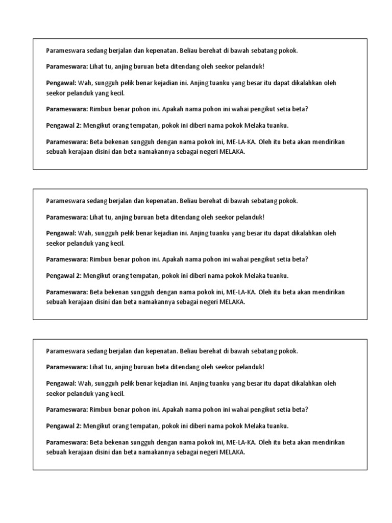 Ilham kepada beliau lalu menamankan tempat tersebut melaka dan berpendapat tempat tersebut sesuai untuk dijadikan negeri. Semasa berburu parameswara melihat seekor pelanduk yang kecil menendang anjing perburuan semasa beliau sedang berehat di bawah sepohon pokokii. Asal usul melaka pengenalan kesultanan melayu melaka diasaskan oleh seorang putera dari palembang iaitu parameswara di antara tahun 1400 hingga tahun 1403 ia merupakan sebuah kerajaan melayu tertua dalam sejarah tanah melayu sejak abad ke 15 menurut kajian yang mutakhir sarjana ada mengemukakan dalam naskhah melayu agung sulalatus salatin bahawa kerajaan melayu telah diasaskan pada tahun 1262. Kurun ke 15 1400 parameswara putera raja dari palembang setelah ditumpaskan oleh majapahit menuju ke temasik nama asal singapura dan akhirnya membuka negeri melaka.