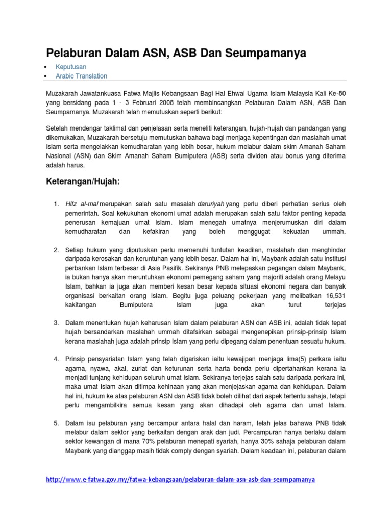 Asb haram atau halal. Ulasan ust zaharuddin bin abdul rahman mengenai fatwa asb dan asn harus pernah di siarkan dlm blog ini bertarikh 6 feb 2008 ramai yang bertanya respond saya ada yang suka dan ada yang keliru. Namun majlis fatwa selangor dan pulau pinang tidak bersetuju dengan pandangan itu. Jadi segala hasil pelaburan itu kotor dan tidak boleh digunakan untuk tujuan peribadi. Sebelum ni matdin ada membuat satiu entri berkenaan dengan soal halal atau haram asb dimana banyak sumber mengatakan ianya haram dan banyak juga sumber yang mengatakan ianya halal.