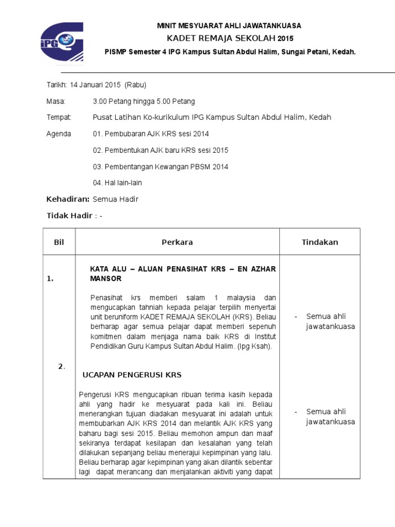 Untuk melihatkan sendiri contoh format minit mesyuarat terkini boleh semak pada pautan gambar di bawah ini contoh format terkini format tidak terlalu berbeza tidak kira anda mesyuarat anda adalah mesyuarat panatia subjek mesyuarat pibg meeting kokurikulum mesyuarat sukan mesyuarat unit bimbingan dan kaunseling ataupun untuk mesyuarat jawatankuasa kurikulum lebih kurang sama sahaja. Menurut beliau ini adalah kali ketiga mesyuarat yang seumpamanya dibuat tetapi malangnya ajk yang telah dibentuk di mesyuarat sebelumnya tidak berjalan atau dalam erti kata lain tidak aktif. 1 2 tujuan mesyuarat ini diadakan untuk membincangkan hal hal yang berkaitan kurikulum dan perancangan panitia tahun 2012. Minit mesyuarat agung pertama.