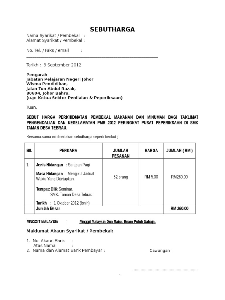 Arkib tender sebutharga. 1 2 pelawaan ini adalah terikat kepada arahan am dan syarat syarat tambahan sebut harga serta syarat syarat yang akan dikeluarkan bersama sama dengan dokumen sebutharga berkaitan. Contoh surat sebut harga makanan have a graphic from the other contoh surat sebut harga makanan it also will include a picture of a sort that could be seen in the gallery of contoh surat sebut harga makanan. Tender sebutharga.