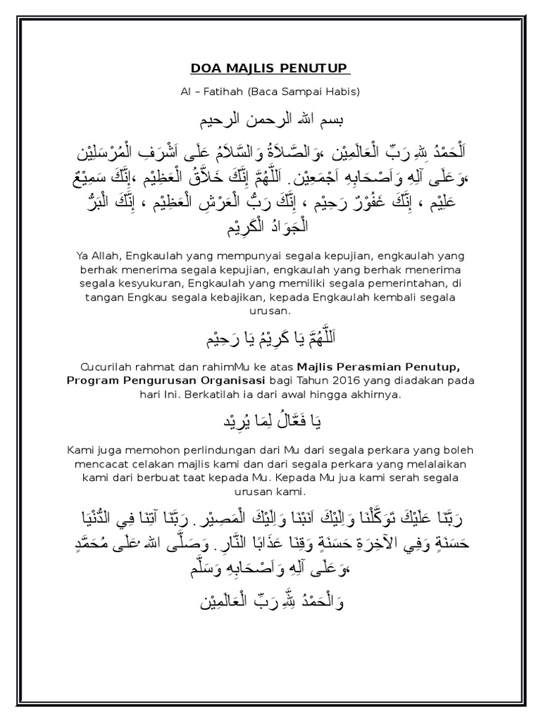 Antara majlis yang sesuai bagi doa ini adalah majlis perpisahan majlis kesyukuran dan perhimpunan sekolah atau agensi kerajaan. Doa majlis perhimpunan 1. Doa merupakan satu ibadat sebagai tanda kerendahan hamba terhadap allah s w t. Doa majlis kebiasaannya dibaca pada permulaan sesuatu majlis.