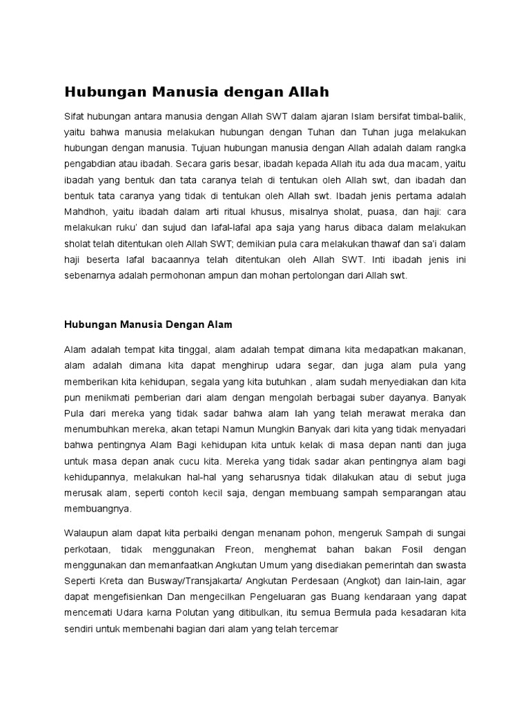 Dengan demikian manusia memiliki keunikan dibanding dengan ciptaan ciptaan lainnya yaitu memiliki bagian materi tubuh dan non materi jiwa roh. Jika rajin sholat zakat puasa dzikir doa alias hubungan dengan allah baik namun hubungan dengan sesama manusia buruk maka bisa bisa jadi orang bangkrut di akhirat nanti. Dalam konteks ini hubungan antara manusia dan alam dapat dipetakan menjadi hubungan struktural yang menempatkan kedua belah fihak dalam posisi yang sama dalam kemakhlukan. Makna hubungan dengan allah hubungan manusia dengan allah subha nahu wa ta ala mengikut keterangan al quran al karim bermaksud supaya manusia menjadikan hidup mati solah dan segala ibadah semata mata untuk nya.