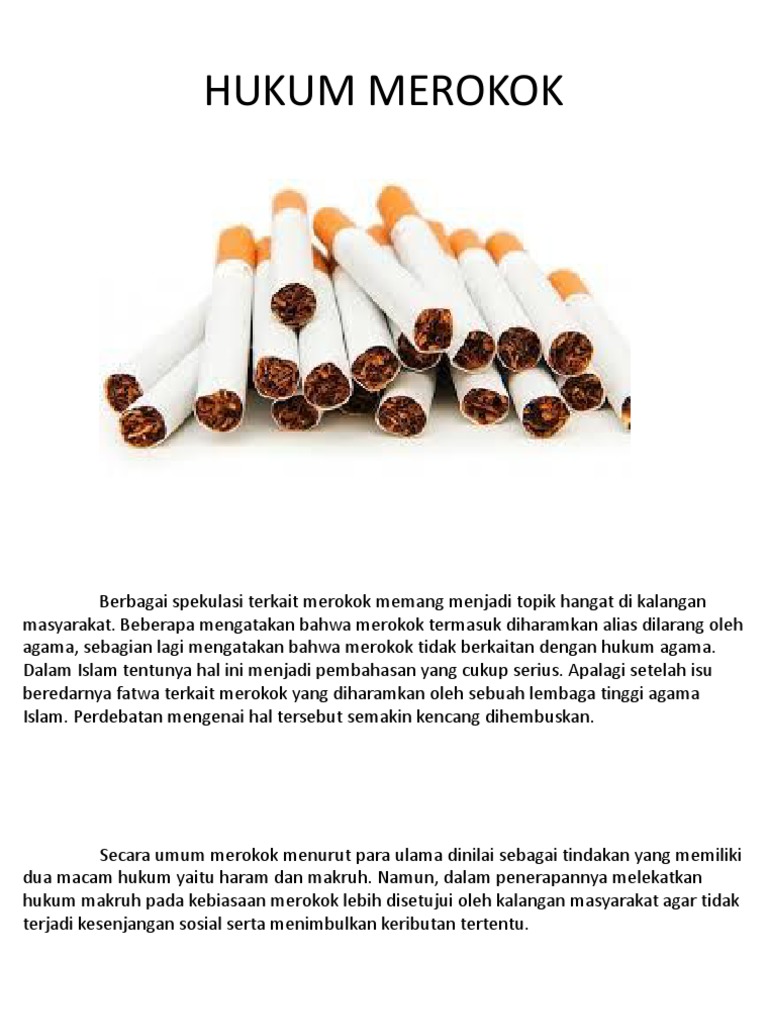 Karena rokok tidak bisa dikatakan halal maka hukum yang bisa dirujuk oleh para ulama untuk rokok ada dua yaitu makruh dan yang terberat haram. Hukum rokok dalam islam. Hukum merokok dalam islam selalu mengundang pro dan kontra. Namun dibalik itu semua indonesia juga merupakan salah satu negara islam terbesar di dunia.