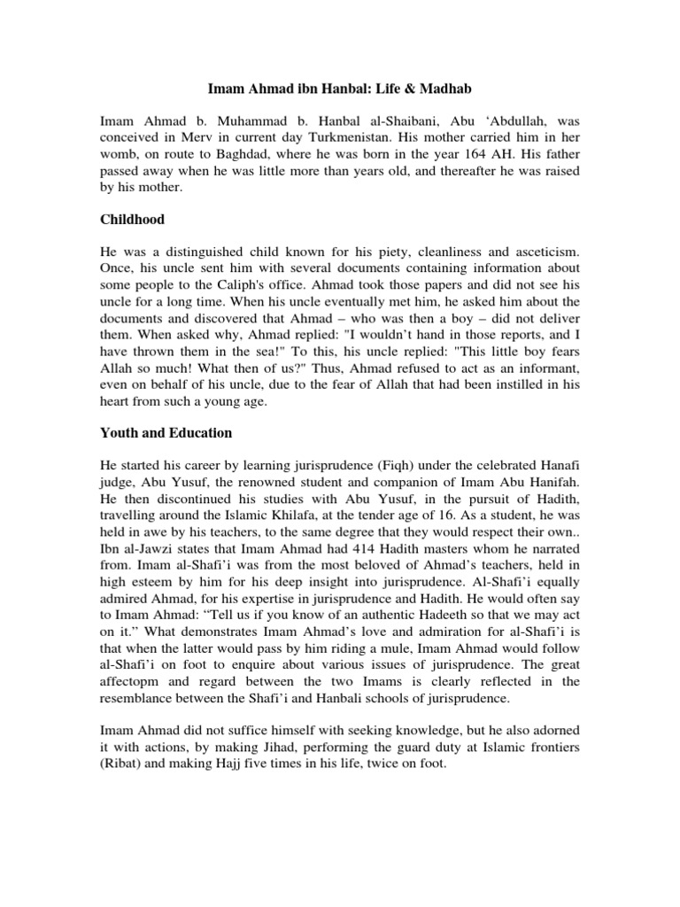 Imam ahmad bin hanbal digelar. Merupakan seorang ahli sunnah yang terbesar soleh dan zuhud. م س ج د ٱل إ م ام أ ح م د ب ن ح ن ب ل romanized. Beliau lahir lebih lewat daripada ketiga tiga rakannya iaitu imam hanafi imam maliki dan imam syafie. It starts from his early life leading to his quest of collecting hadith of prophet muhammad pbuh until his death.