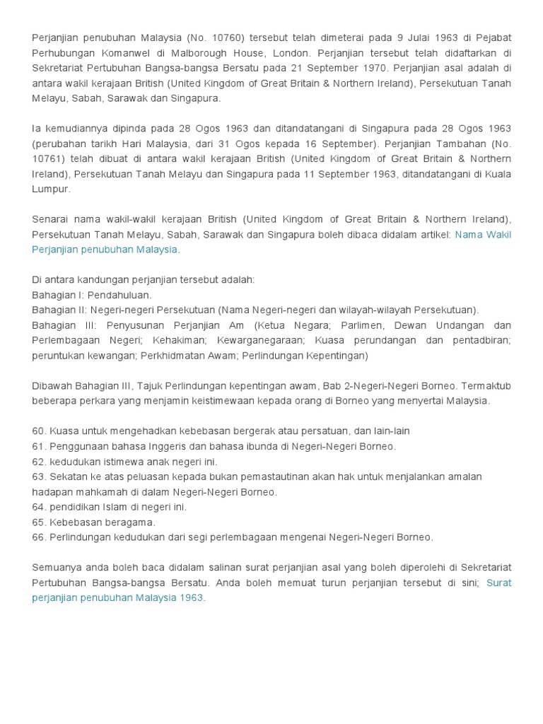 Intipati perjanjian penubuhan malaysia 1963. Perjanjian malaysia adalah suatu perjanjian antarabangsa berdaftar di dalam pertubuhan bangsa bangsa bersatu pada 21 september 1970 dengan nombor pendaftaran 10760. Pembahagian kerusi sabah mendapat 16 kerusi sarawak 24 kerusi dan singapura 15 kerusi yang mewakili kawasan parlimen bahasa melayu ialah bahasa kebangsaan tetapi bahasa inggeris dan bahasa lain masih boleh digunakan sarawak dan sabah diberikan kuasa untuk mengawal hal ehwal. Berikut merupakan 11 perkara yang. Malaysia akhirnya diisytiharkan pada 16 september 1963.