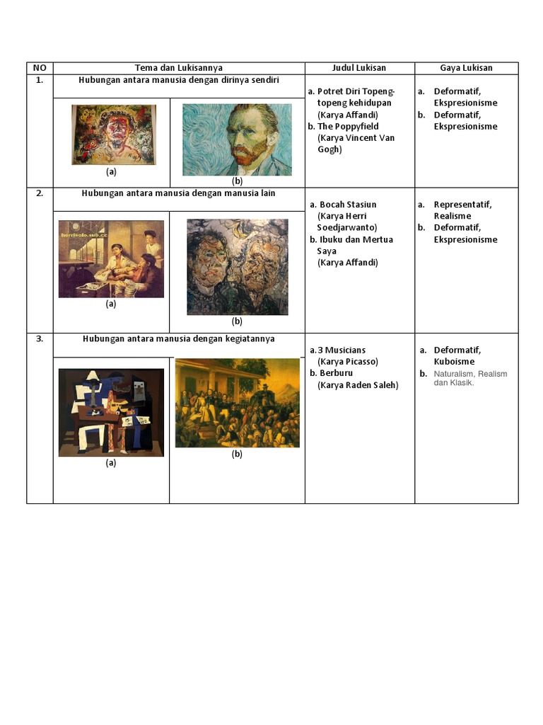 Tema seni rupa murni semua karya seni rupa di buat berdasarkan tema yang di angkat. Memahami tema seni rupa dua dimensi atau tiga dimensi berarti kita dapat memahami tujuan pencipta karya tersebut. Hubungan antara manusia dengan dirinya potret diri topeng topeng kehidupan karya affandi deformatif ekspresionisme 2. Berikut ini kita akan membaha mengenai tema seni rupa murni yaitu hubungan antara manusia dengan manusia lain alam sekitar benda dan aktifitasnya.