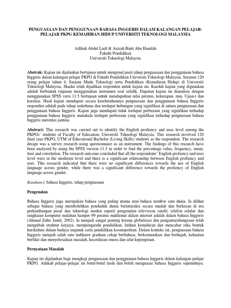Bahasa global ini digunakan dengan meluas dan perlu dikuasai terutama golongan pelajar yang akan meneroka bidang ilmu dalam bidang pendidikan seterusnya diaplikasi dalam dunia pekerjaan. Kepentingan penguasaan bahasa inggeris tidak dapat dipertikaikan walaupun bahasa melayu menjadi bahasa kebangsaan di malaysia. Penggunaan bahasa tersebut dalam kalangan pelajar pelajar pkpg serta melihat perbezaan merentas jantina. Selain itu ia juga bertujuan untuk melihat hubungan dengan penghargaan kendiri dan antara tret tret personaliti.
