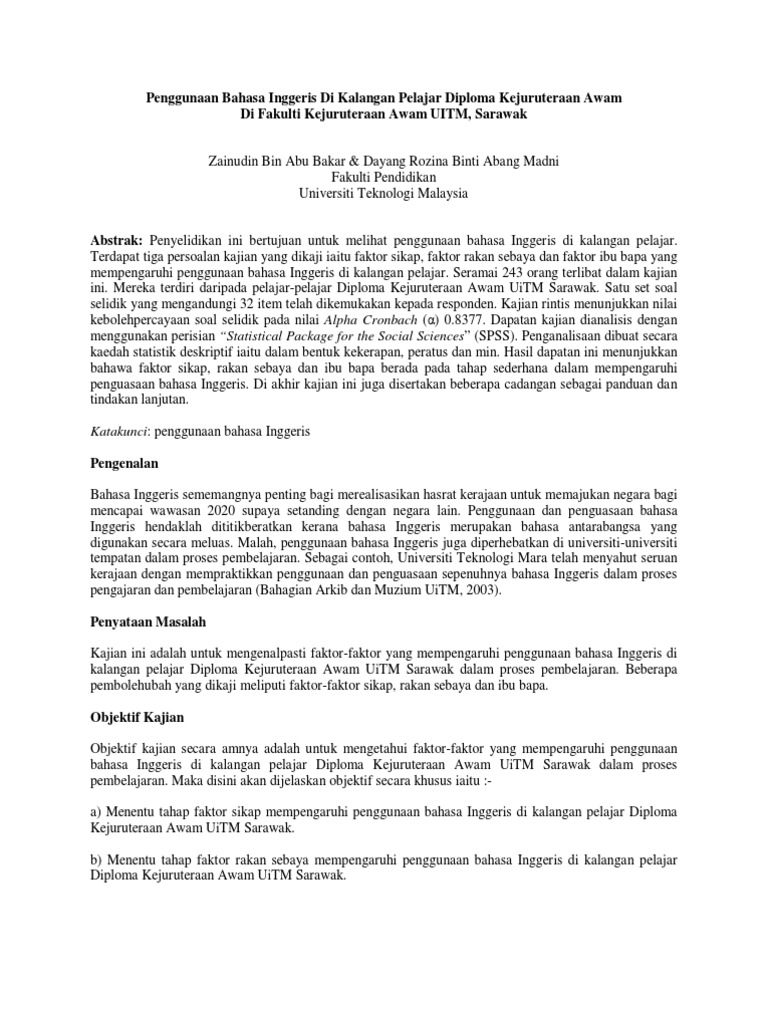 Kajian penggunaan bahasa inggeris dalam kalangan pelajar. Penggunaan bahasa inggeris dalam pembelajaran meliputi kemahiran lisan bertulis dan mendengar dan kedua. Kekerapan penggunaan bahasa inggeris dalam kehidupan seharian. Objektif kajian objektif kajian ini adalah untuk 1. Penguasaan bahasa inggeris dalam kalangan pelajar tahun satu di ukm 32 kepada kemahiran tersebut.