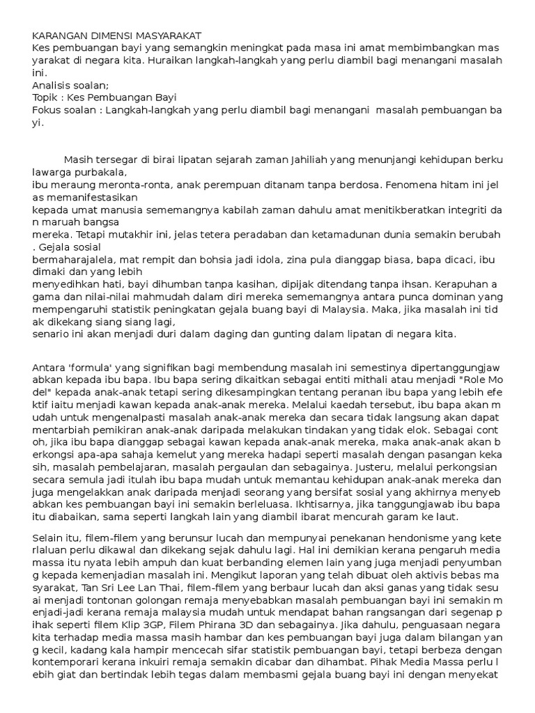 Karangan kes pembuangan bayi dewasa ini masalah sosial dalam kalangan masyarakat semakin menjadi jadi bagai cendawan tumbuh selepas hujan. Contoh karangan bahasa melayu pt3 ini bukan sekadar untuk dibaca tetapi perhatikan setiap penggunaan ayat kata wacana penyelitan peribhasa dan gaya bahasa yangmenarik digunakan dalam karangan ini. Biasanya golongan remaja yang kurang didikan agama merupakan golongan yang paling banyak menyumbang kepada masalah ini tambahan pula remaja yang kurang didikan agama akan menyebabkan mereka tiada mempunyai perasaan tentang sikap bertanggungjawab dan akhirnya sanggup mengorbankan. Bayi ini setelah dewasa tidak akan dapat mengenali siapa ibu bapa kandung sebenarnya selain itu bayi ini akan berasa sangat sedih dan kecewa akan sikap ibu bapa kandungnya yang membuangnya dan tidak menjaganya.