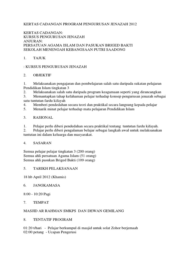 Kertas kerja pengurusan jenazah masjid. ì muqaddimah pengurusan jenazah adalah fardu kifayah dan wajib dipelajari dan diketahui oleh semua orang islam perkara ini tidak hanya perlu diketahui oleh imam bilal atau pegawai syarak tetapi ianya adalah ilmu yang wajib dituntut oleh orang orang yang beriman. Kematian kewajipan yang hidup menyempurnakan mayat orang islam yang bukan mati shahid itu fardhu kifayah. 01 20 t hari pelajar berkumpul di masjid untuk solat zohor berjemaah. Program bertujuan menyediakan pengurusan jenazah komprehensif berlandaskan prinsip syariah islam yang sistematik dan bersepadu.