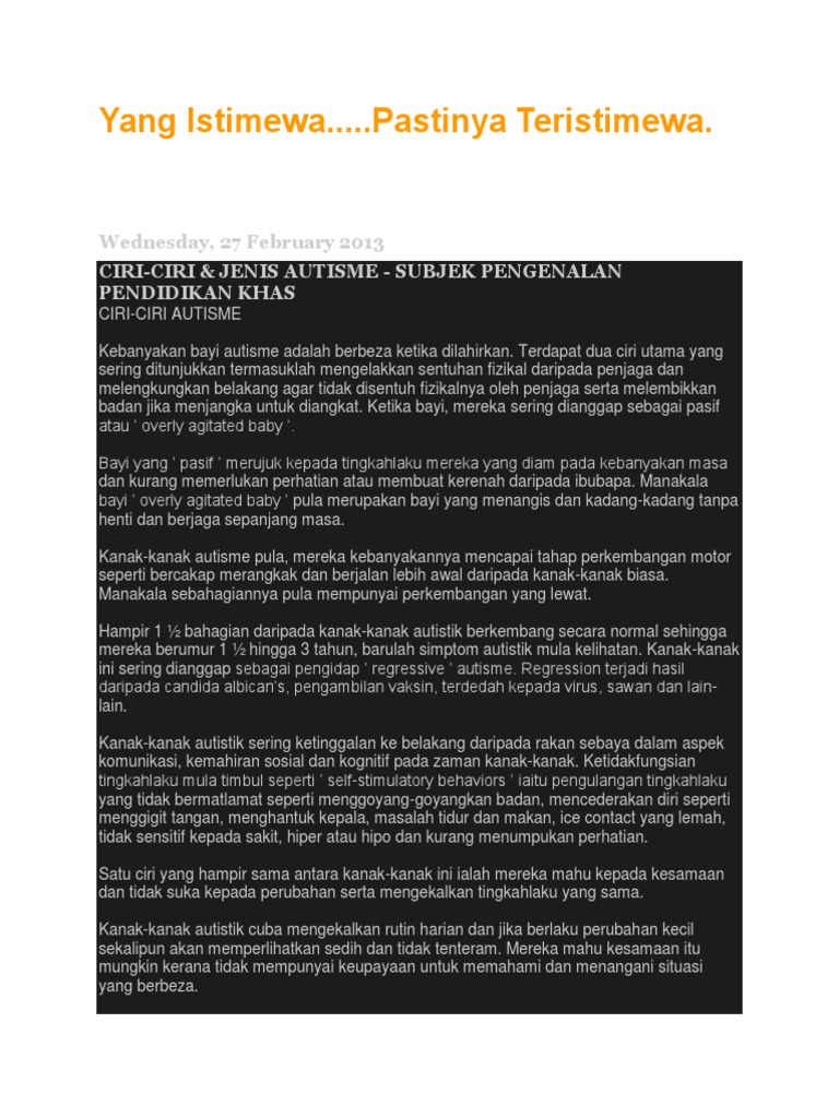 Pendekatan ini perlu dilakukan secara konsisten sama ada di sekolah atau rumah bagi mendapat perubahan yang memberangsangkan. Kualitas komunikasinya tidak normal adanya gangguan dalam kualitas interaksi sosial dalam aktivitas perilaku serta interesnya sangat terbatas diulang ulang dan streotip. 3 0 ciri sampingan kanak kanak autisme. Autisme masa kanak kanak dini adalah penarikan diri dan kehilangan kontak dengan realitas atau orang lain.