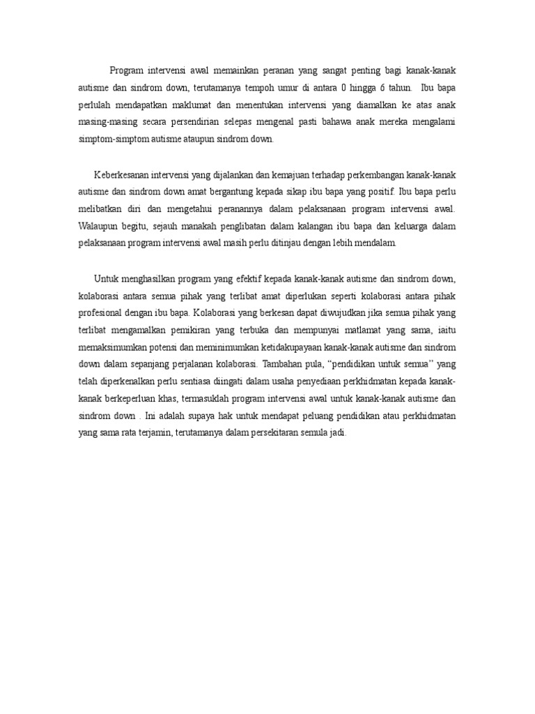 Kesimpulan kanak kanak autisme. Kanak kanak autistik menghadapi masalah untuk berkomunikasi menjalin hubungan sosial dan berfikir secara kreatif pada peringkat bayi anak autistik tidak peduli. Kanak kanak autisme pada tahap ringan berpeluang untuk mencapai tahap perkembangan normal seperti kanak kanak lain sekiranya mendapat rawatan multidisiplin seawal usia dua 2 hingga tiga 3 tahun. Autism ialah gangguan pertumbuhan tumbesar seseorang dalam jangka masa panjang yang memberi kesan dalam pemikiran kanak kanak dan dalam proses informasi. Anak anak autisme tidak mampu membentuk jalinan emosi dengan orang lain.