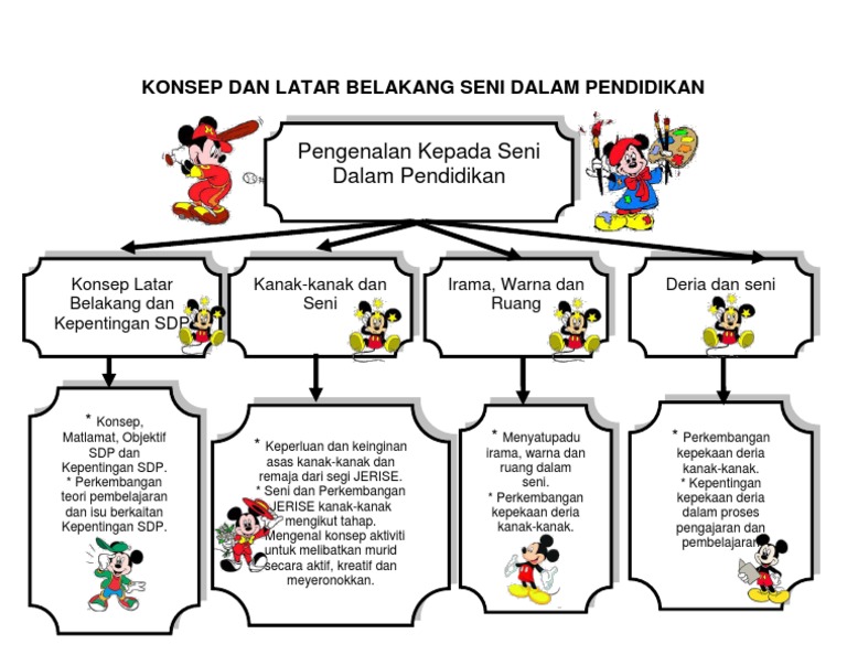 Konsep seni dalam pendidikan. Konsep ini mulai dikembangkan oleh plato dalam tesisnya art should be the basis of education. Dalam pendidikan seni di sekolah dasar konsep pendidikan seni diarahkan pada pembentukan sikap sehingga terjadi keseimbangan intelektual dan sensibilitas rasional dan irasional akal pikiran dan kepekaan emosi. 1 3 konsep latar belakang dan kepentingan seni dalam pendidikan 1 3 1 konsep dan latar belakang merangkumi 3 bidang iaitu seni visual muzik dan pergerakan dalam pembelajaran dan perkembangan kanak kanak. Sistem pendidikan seni model pertama ini menganut prinsip pendidikan di dalam seni education in arts.