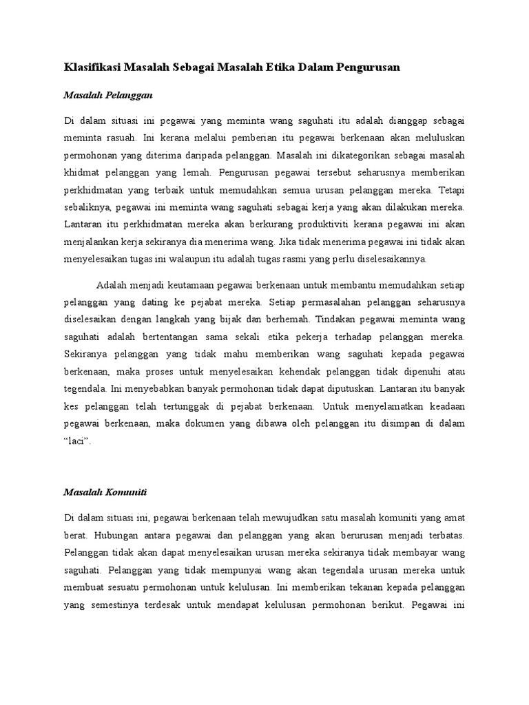 Masalah etika selalu muncul dalam situasi yang melibatkan orang lain tetapi seringkali organisasi lebih banyak menyoroti masalh etika ini daripada pihak pihak lainnya. Contoh masalah etika dalam pengurusan dengan ciri masalah etika 1 0 pengenalan kisah ini berlaku pada 4 tahun yang lalu. Contoh masalah etika dalam pengurusan dengan ciri masalah etika 1. Bagi sebagian orang perilaku etis dalam organisasi tidak selalu penting.