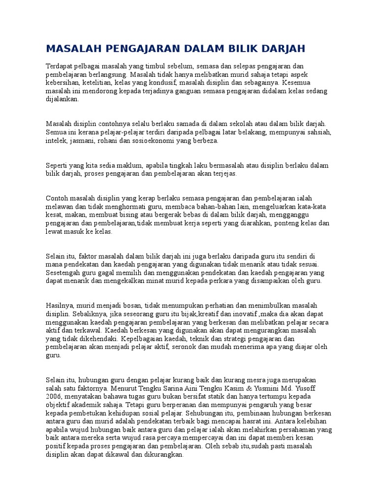 Masalah pengajaran dan pembelajaran dalam bilik darjah. Data temu bual mendapati bahawa iq yang berbeza tidak menguasai kemahiran membaca menulis dan bertutur merupakan antara masalah pengajaran bahasa melayu di bilik darjah. Contoh masalah disiplin yang kerap berlaku semasa pengajaran dan pembelajaran ialah melawan dan tidak menghormati guru membaca bahan bahan lain mengeluarkan kata kata kesat makan membuat bising atau bergerak bebas di dalam bilik darjah mengganggu pengajaran dan pembelajaran tidak membuat kerja seperti yang diarahkan ponteng kelas dan lewat masuk ke kelas. Hal ini memerlukan kepakaran guru dalam menentukan strategi pengajaran dan pembelajaran. Iklim bilik darjah menimbulkan suasana yang kurang selesa.