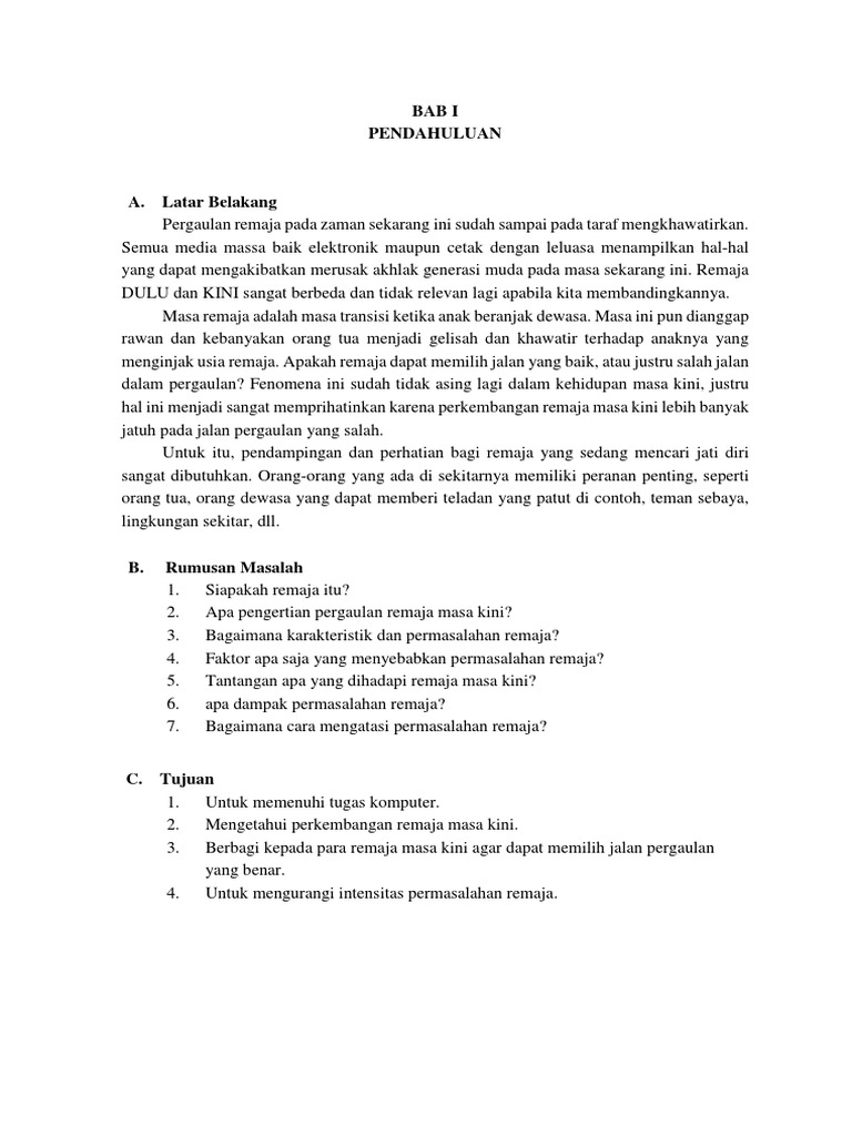Masalah yang dihadapi oleh remaja masa kini. Banyak masalah yang umumnya akan dihadapi oleh para remaja yang biasanya cukup membuat pusing para orang tua. Cabaran cabaran yang perlu dihadapi oleh remaja pada masa ini dan pada masa hadapan pada era globalisasi ini pihak media massa sering memperkatakan proses membentuk sebuah dunia tanpa sempadan dan kedudukan geografi. Ingin tahu apa saja masalah yang harus dihadapi oleh remaja. Masalah remaja tentunya tak jarang lagi mendengar atau menonton dan bahkan melihat yang terjadi disekitar kita.