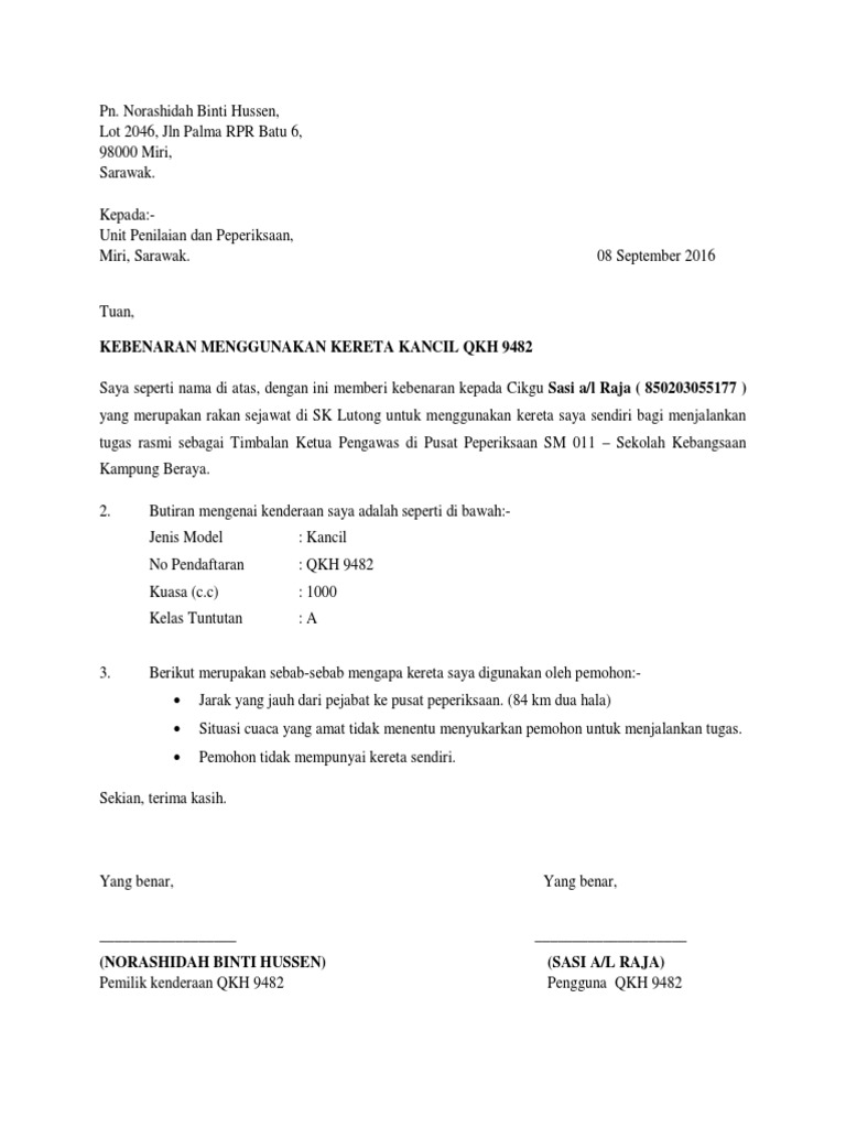 Memberi contoh surat kebenaran menggunakan kenderaan. Saya mengaku adalah amat mustahak bagi pegawai ini menggunakan kenderaan beliau dalam perjalanan tersebut di atas dan permohonan adalah diluluskan dengan syarat syarat mengikut perenggan 4 7 3 pekeliling perbendaharaan bil. Setiap perkataan frasa dan terma dalam contoh di bawah adalah bersifat peribadi tidak terikat dengan mana mana pihak individu dan perundangan negara penulis blogger hanya. Kenderaan tersebut perlu mengikut bilangan tempat duduk dan tidak boleh membawa lebih muatan. Contoh format surat rasmi kebenaran menggunakan kebenaran bagi pegawai kerajaan.