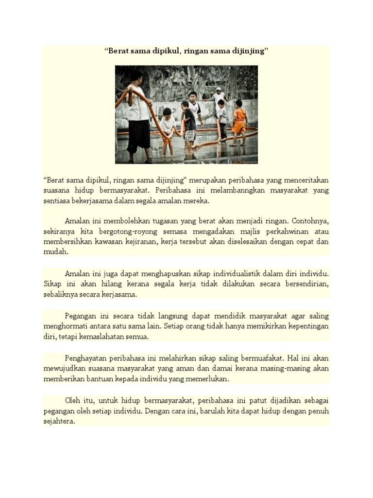 Peribahasa berat sama dipikul ringan sama dijinjing dalam bahasa inggris. Berat sama dipikul ringan sama dijinjing merupakan peribahasa yang menceritakan suasana hidup bermasyarakat. A trouble shared is a trouble halved. Semua penduduk kampong seri pinang bergotong royong membersihkan kawasan kampong mereka bak kata pepatah ringan sama dijinjing berat sama dipikul. Berat sama dipikul ringan sama dijinjing ogos 11 mei 3 mac 2.
