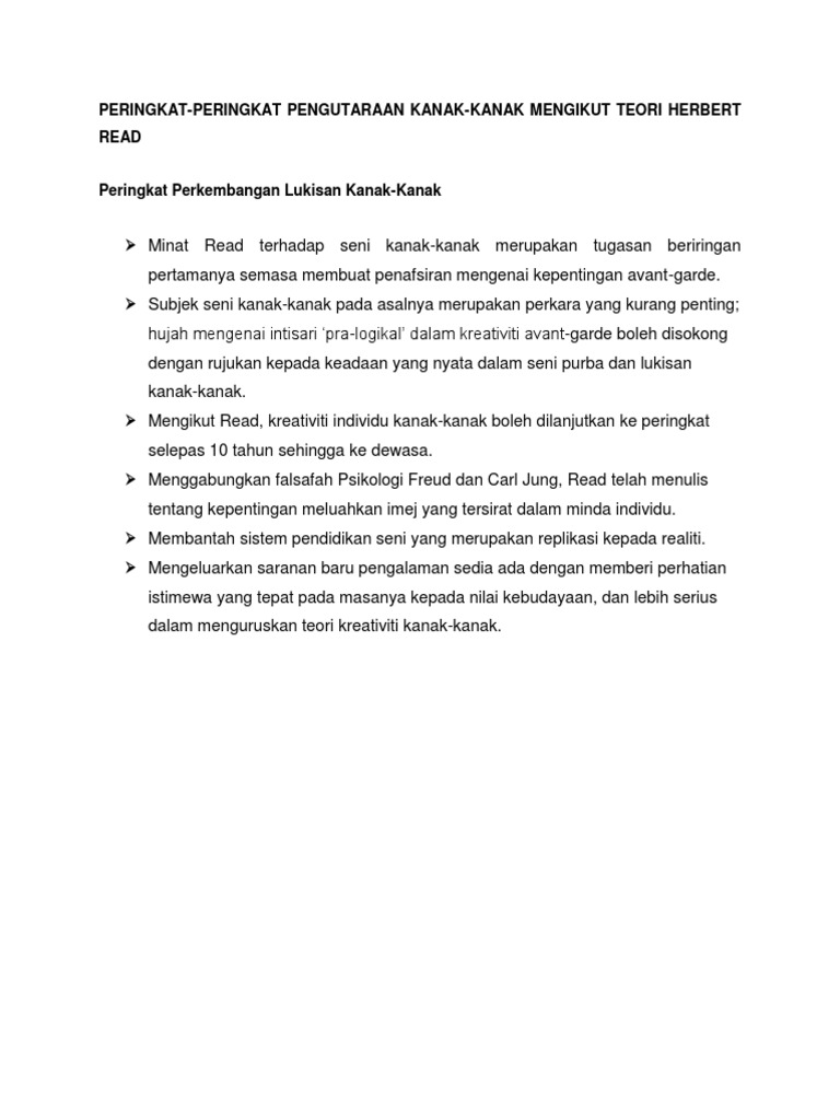 Peringkat perkembangan lukisan kanak kanak herbert read. Peringkat perkembangan lukisan kanak kanak menurut herbert read minat read terhadap seni kanak kanak merupakan tugasan sampingan pertamanya semasa membuat penafsiran mengenai kepentingan avant garde. Semasa sesi tutorial di ipg anda telah menyenaraikan kekuatan beberapa teori yang merupakan latar belakang yang memberi sumbangan atau memainkan peranan terhadap teori perkembangan pengutaraan tampak kanak kanak. Lenny anak mangai regina anak kadir biodata herbert read nama penuh. Peringkatperkembanganlukisankanak kanakmenurut herbert read br dibentangkanoleh br eric chungxianlong.