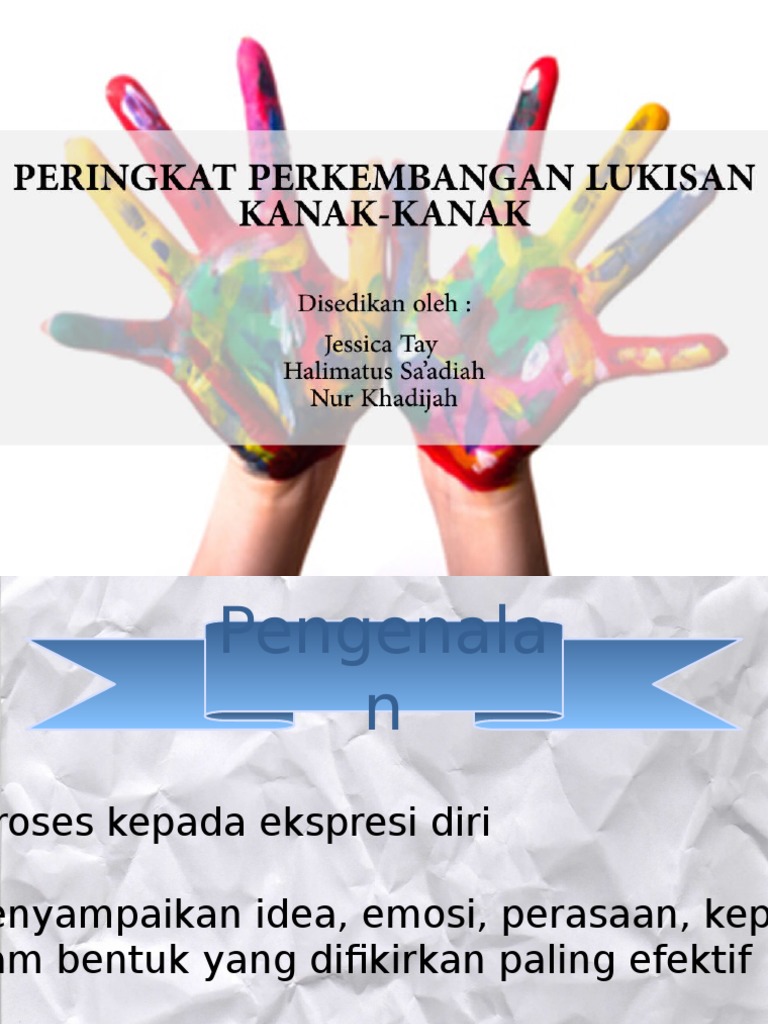 Peringkat perkembangan lukisan kanak kanak. Lukisan yang dihasilkan oleh kanak kanak pada peringkat ini misalnya dihasilkan secara bebas mengikut kemampuan yang sesuai dengan perkembangan fizikal mereka yang belum stabil. Kreativiti pengalaman membolehkan kanak kanak meluahkan keinginan dan keperluan mereka. Menghuraikan konsep kreativiti estetika dan ekspresi visual 5. Membanding beza peringkat pengutaraan tampak kanak kanak 3.