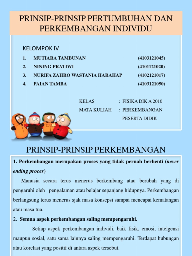 Prinsip pertumbuhan dan perkembangan kanak kanak. Kriteria perkembangan masa kanak kanak akhir pertumbuhan fizik perubahan fizikal dapat dilihat melalui ketinggian yang meningkat berat bertambah dan mereka menjadi semakin kuat dan bertenaga. Perkembangan dapat diartikan sebagai perubahan yang progesif dan kontinyu dalam diri individu dari mulai lahir sampai mati. Setelah sebelumnya kita memahami tentang hakikat dan makna pertumbuhan dan perkembangan pada anak usia dini dengan klasifikasi masing masing dan perbedaan serta hubungannya antara yang satu dengan yang lain pada artikel kali ini kita akan mencoba membahas prinsip prinsip yang ada dalam masa perkembangan anak usia dini. Kajian terhadap perkembangan dan pertumbuhan kanak kanak telah lama dibuat oleh tokoh tokoh psikologi.