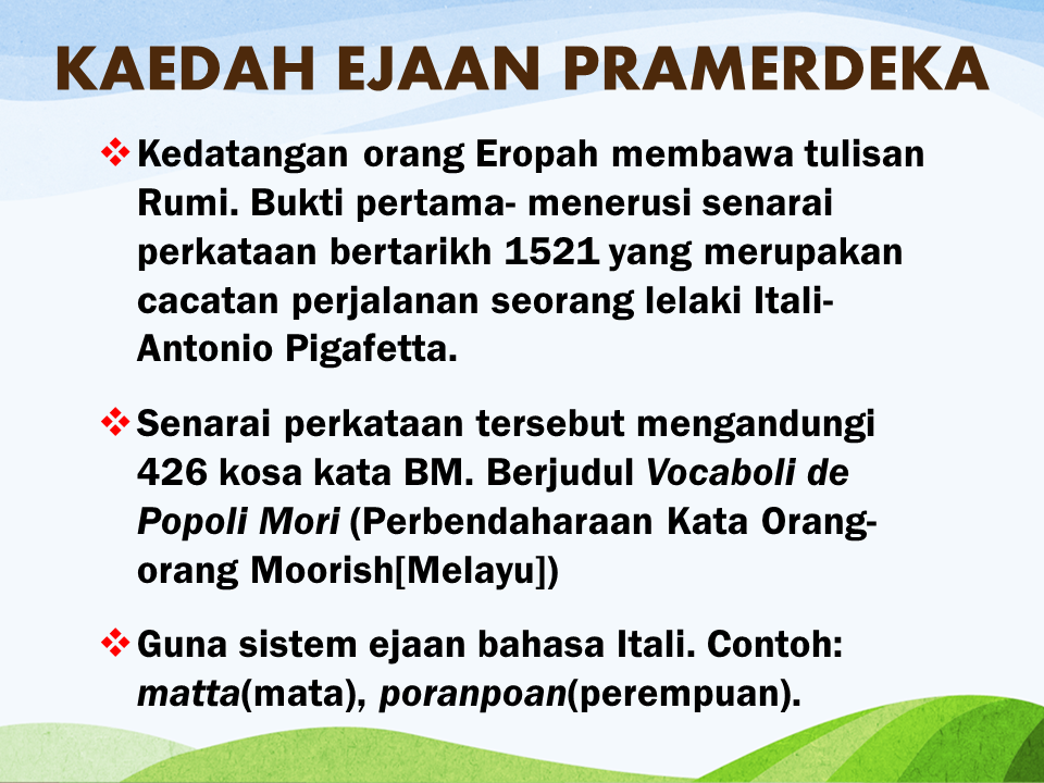 Bukti pertama menerusi senarai perkataan bertarikh 1521 yang merupakan catatan perjalanan seorang lelaki itali antonio pigafetta. Oleh sebab itu ejaan yang bertukar tukar ini menjadikan kita keliru dan tidak peka sekaligus membawa kepada kesalahan ejaan setiap kali kita menulis. Berjudul vocaboli de popoli mori perbendaharaan kata orang orang moorish melayu. Kaedah ejaan pramerdeka kedatangan orang eropah membawa tulisan rumi.