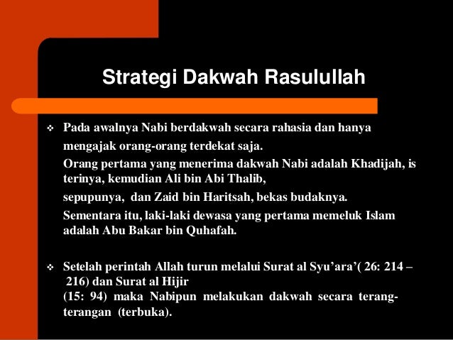 Strategi dakwah rasulullah saw dalam berusaha mencapai tujuan yang luhur tersebut sebagai berikut. Dakwah secara sembunyi sembunyi selama 3 4 tahun pada masa dakwah secara sembunyi sembunyi ini rasulullah saw menyeru untuk masuk islam orang orang yang berada di lingkungan rumah tangganya sendiri dan kerabat serta sahabat dekatnya. Substansi dan strategi dakwah rasulullah saw. Strategi lain yang dilakukan oleh rasulullah saw pada saat awal awal dakwahnya di mekkah adalah menggunakan metode dakwah dengan hikmah dan uswah hasanah.