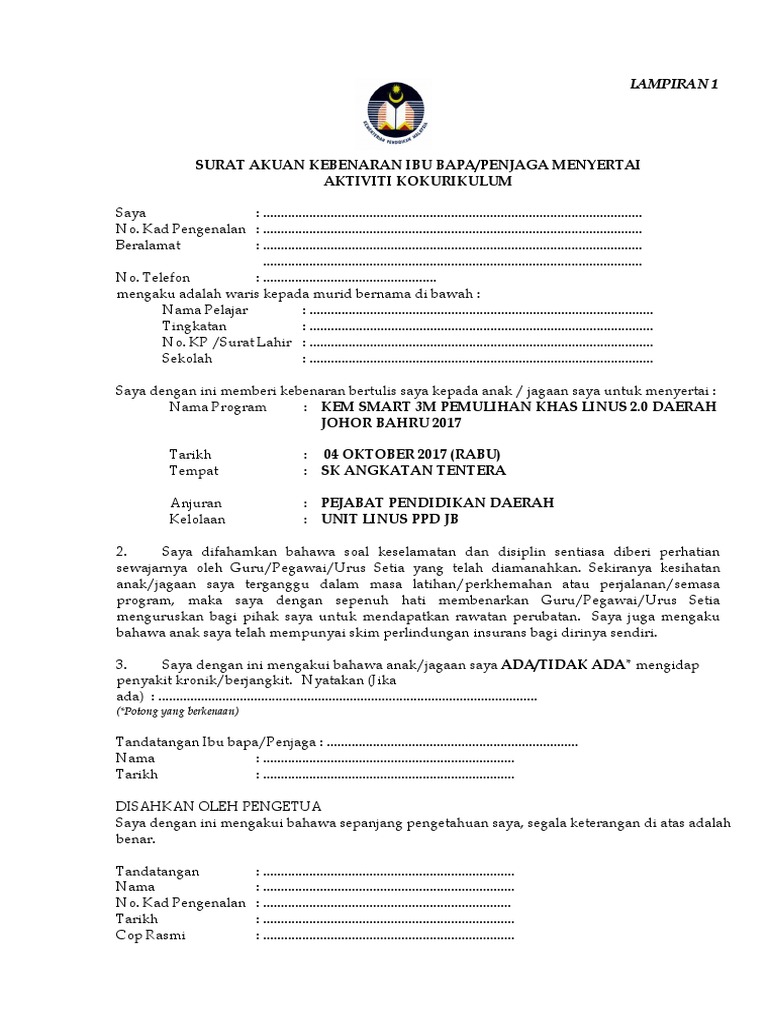Surat akuan dan kebenaran ibu bapa penjaga kepada. Oleh yang demikian saya mengakui bahawa pihak sekolah tidak bertanggungjawab atas apa apa kejadian atau kemalangan yang berlaku sepanjang kegiatan tersebut bukan disebabkan oleh kelalaian guru yang bertugas. Carousel previous carousel next. Anda di halaman 1 dari 1.