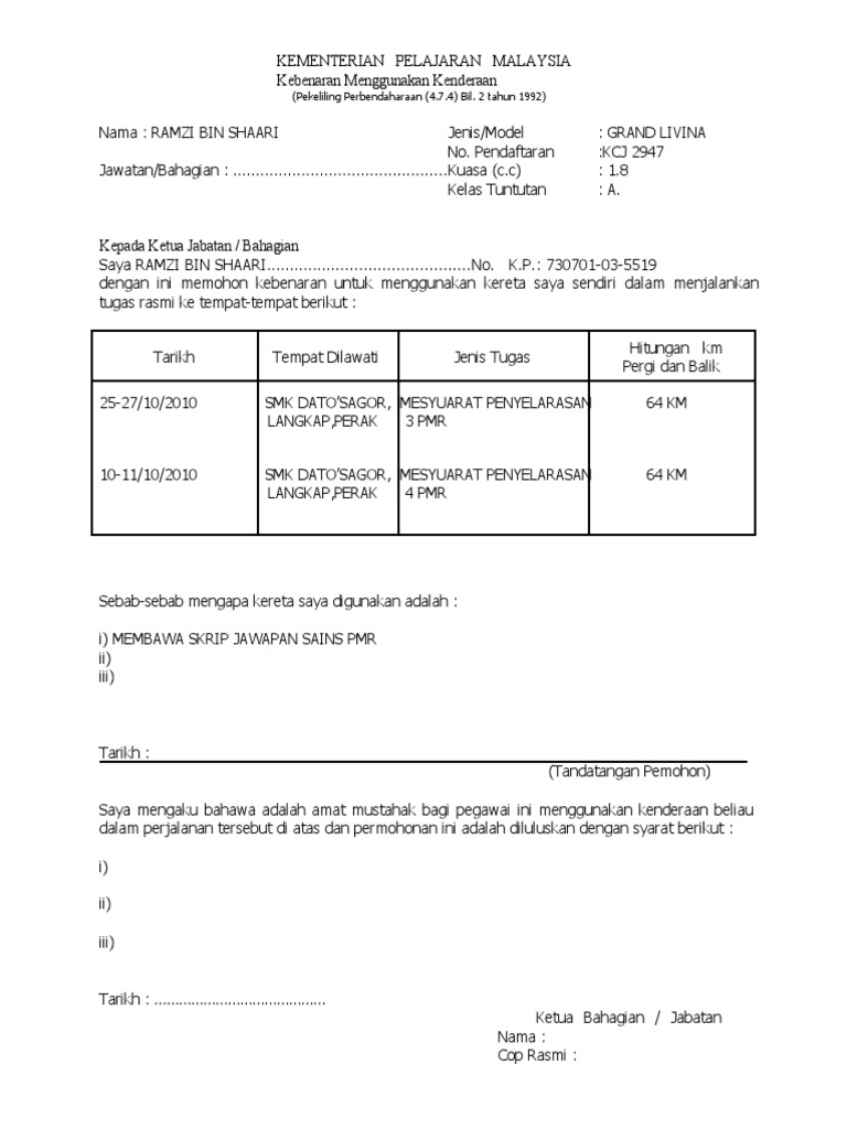 Surat kebenaran menggunakan kenderaan sendiri kpm. Surat kebenaran membawa kenderaan sendiri ini biasanya ditandatangai oleh guru besar atau pengetua dan mesti dijelaskan secara terperinci kenderaan yang digunakan oleh guru penumpang dan waktu menggunakan kenderaan tersebut. Slm kak nak tanye contoh sambung bayar jika pihak kedua tidak bayr asuran selama 3 bulan berturut turut kereta tersebut akan berpindah milik kepada pihak pertama adakah kita bolh tulis. Dengan ini saya memohon kebenaran untuk menggunakan kenderaan saya sendiri dalam menjalankan tugas rasmi ke tempat tempat berikut dan menuntut elaun hitungan kilometer kelas a. Surat kebenaran bawa kenderaan 1.