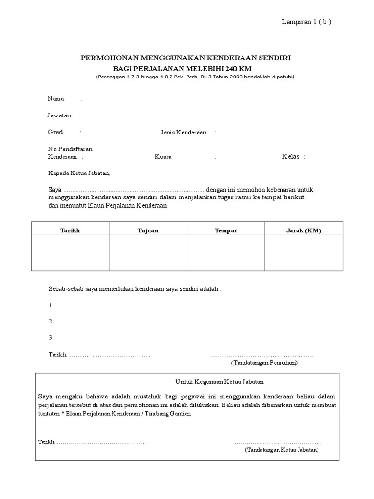 Surat kebenaran menggunakan kenderaan sendiri melebihi 240km. Atas tugasan rasmi dan penting tiada kenderaan jabatan disediakan dan mempunyai alasan yang munasabah untuk menggunakan kereta sendiri pegawai perlu isi borang kebenaran membawa kenderaan sendiri boleh. Borang permohonan kebenaran menggunakan kenderaan untuk urusan rasmi kursus jika menggunakan kenderaan sendiri bagi perjalanan melebihi 240km sehala borang bpijkm kew 03 borang pengesahan keluar pejabat untuk menjalankan tugas rasmi bagi yang tiada arahan bertulis minit surat arahan dari ketua jabatan. Memohon untuk menggunakan kenderaan sendiri pada. Kelulusan menggunakan kenderaan sendiri bagi perjalanan melebihi 240km selaras pekeliling perbendaharaan bil 3 2003 para 4 7 4 perlu menjalankan tugas rasmi di beberapa tempat di sepanjang perjalanan.