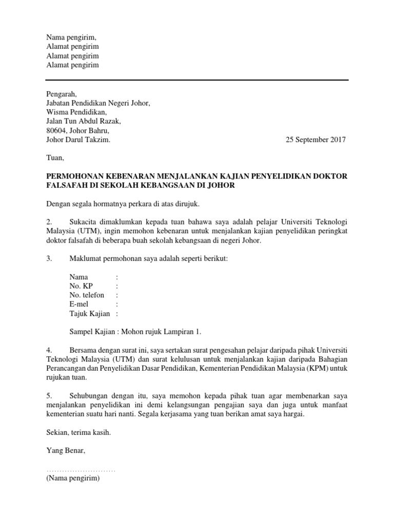 Kami tarikh cik low suet fin no 3 jalan ss2 5 47300 petaling jaya. If you are looking for contoh surat kebenaran untuk menjalankan kajian you ve come to the right place. Bagi menjalankan sesebuah kajian di sekolah kebenaran pihak jabatan pendidikan negeri amat penting bagi memastikan kajian tersebut adalah benar dan mengikut prosedur. Bahagian perancangan dan penyelidikan dasar pendidikan kementerian pelajaran malaysia aras 1 4 blok e 8 kompleks kerajaan parcel e pusat pentadbiran kerajaan persekutuan 62604 putrajaya.