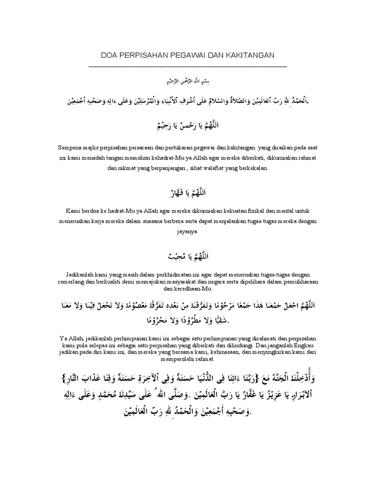 Assalamualaikum tuan mohon keizinan dari tuan untuk jadikan teks bacaan doa saya. Friday september 28 2012 pembukaan doa. Oleh itu wajarlah kiranya majlis persaraan seseorang itu tak kiralah sama ada beliau seorang guru pegawai kerajaan atau apa jua pekerjaan diakhiri dengan iringan bacaan doa majlis persaraan. Doa sempena majlis persaraan dan perpisahan bismillahirrahmanirrahimm alhamdulillahi rabbil alamin wassolatu wassala muala asyrafil ambiya iwal mursalin waala alihi wasahbihi ajma in.