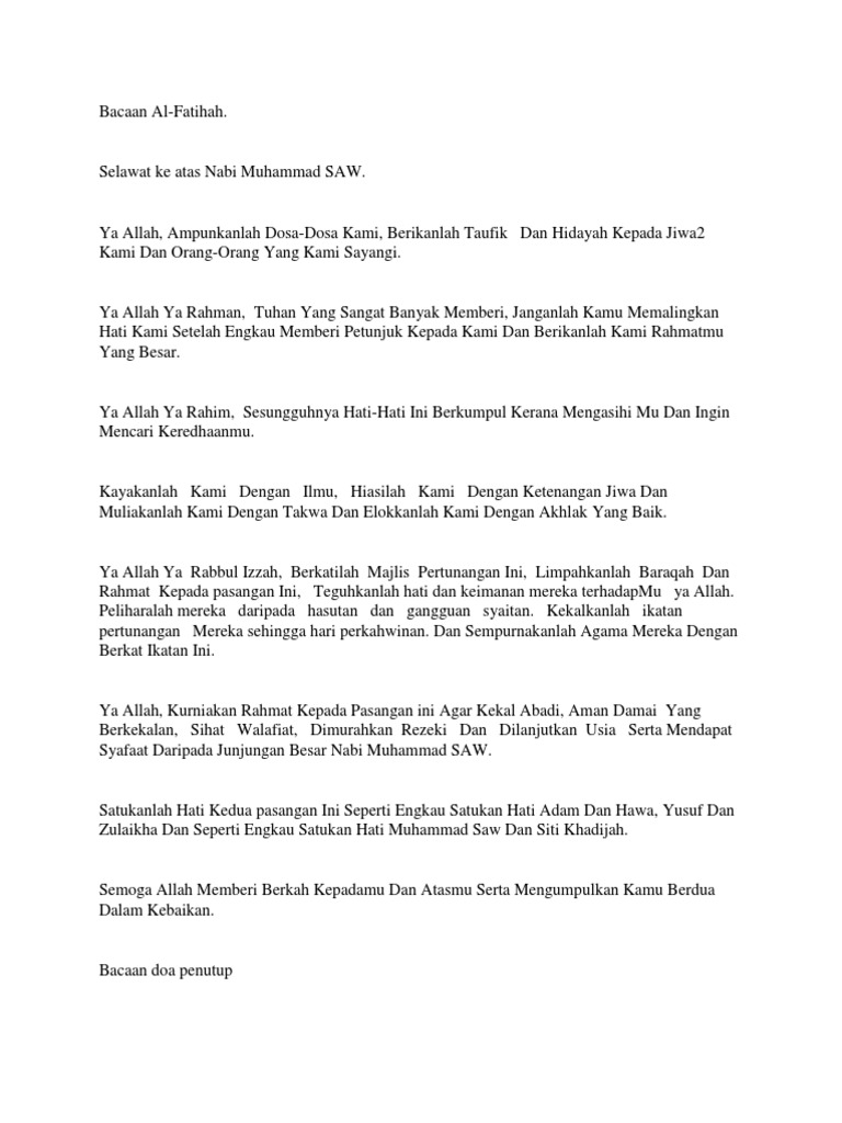 Doa merupakan satu cara hidup yang diajar oleh rasulullah s a w dimana sesuatu doa itu perlulah dilakukan secara ikhlas khusyuk dan tawadu. Teks doa selepas majlis pertunangan koleksi org july 9th 2018 teks doa selepas majlis pertunangan on 8 july 2018 6 28 informasi kali ini adalah seputar pembahasan tentang teks doa selepas majlis pertunangan dan juga beberapa artikel lain yang ada hubunganannya dengan pembahasan kali ini di 0 koleksi org majlis pertunangan destinasiku. Doa majlis perhimpunan 1 ب س م الله الر ح م ن الر ح ي م ا ل ح م د ل ل ه ر ب ال ع ال م ي ن و الص لا ة و الس لا م ع ل ى س ي د ن ا م ح م د و ع ل ى آل ه و أ ص ح اب ه أ ج م ع ي ن. Begitu juga dengan upacara bertunang yang menjadi adat bagi masyarakat melayu di malaysia.