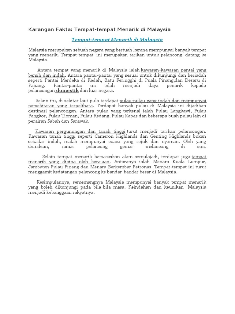 Karangan spm pelancongan. Contoh karangan pelancongan. Antara tempat yang menarik di malaysia ialah kawasan kawasan pantai yang bersih dan indah. Mereka ingin menjadikan percutian di malaysia sebagai serampang dua mata.