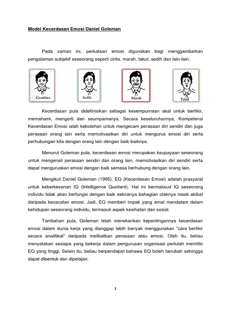 Teori kecerdasan emosi goleman. Salovey dan mayer mendefinisikan kecerdasan emosional atau yang sering disebut eq sebagai himpunan bagian dari kecerdasan sosial yang melibatkan kemampuan memantau perasaan sosial yang melibatkan kemampuan pada orang lain memilah milah semuanya dan menggunakan informasi ini. Kompetensi sosial 1 kesedaran sosial 2 kemahiran sosial komponen komponen dan subkomponen kecerdasan emosi kompetensi peribadi kompetensi sosial. Menurut goleman kecerdasan emosional adalah kemampuan seseorang mengatur kehidupan emosinya dengan inteligensi to manage our emotional life with intelligence. Dengan kecerdasan emotional tersebut seseorang individu dapat menempatkan emosinya pada posisi.