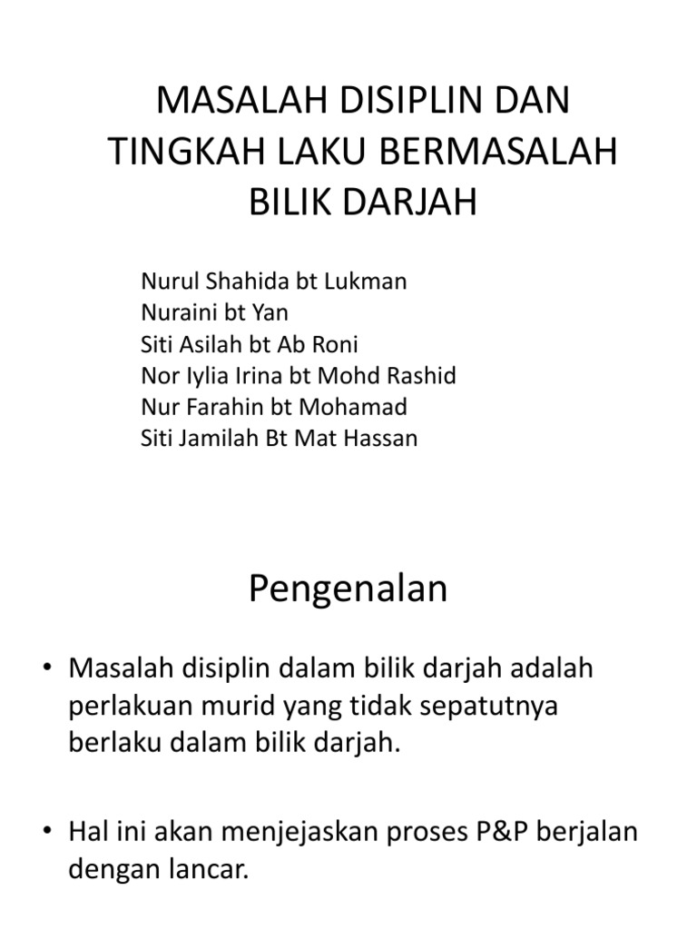 Tingkah laku bermasalah dalam bilik darjah. Hal ini dapat membantu guru dan ali memahami apa yang ali sedang buat dan membuktikan kepada ali bahawa tingkah lakunya tidak akan membawa hasil yang diinginkan pada peringkat keempat pula perancangan dan perubahan tingkah laku menyeluruh iaitu guru perlu mengenalpasti keperluan ali yang benar benar diharapkan untuk mengawal tingkah lakunya. Tingkah laku bermasalah dalam bilik darjah. Dibentangkan oleh fatihah binti mohamad khazinorehan binti kamarudinmohamad nasiruddin bin romlimohamad azim bin mohamedmohamad hafiz bin ramli 2. Selain dari disiplin soal tingkah laku di dalam bilik darjah juga merupakan masalah dan halangan dalam pengurusan bilik darjah.