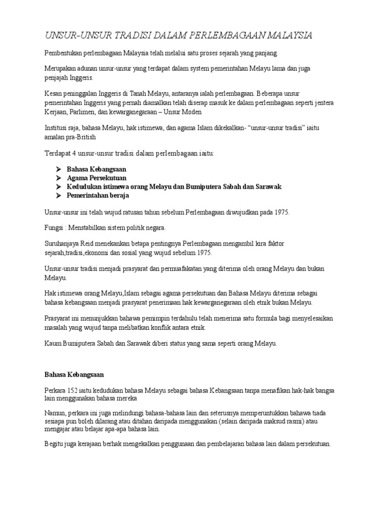 Unsur unsur tradisi dalam perlembagaan negara 1948 1963 disediakan oleh. Unsur unsur tradisi dalam perlembagaan persekutuan. Keunikan perlembagaan persekutuan ini dapat dilihat berasaskan unsur unsur tradisi yang menjadi tiang seri kepada undang undang tertinggi negara ini. Hal yang demikian unsur unsur tradisi ini hendaklah dinilai dan difahami dengan baik bagi memastikan tidak timbul perselisihan faham antara rakyat.