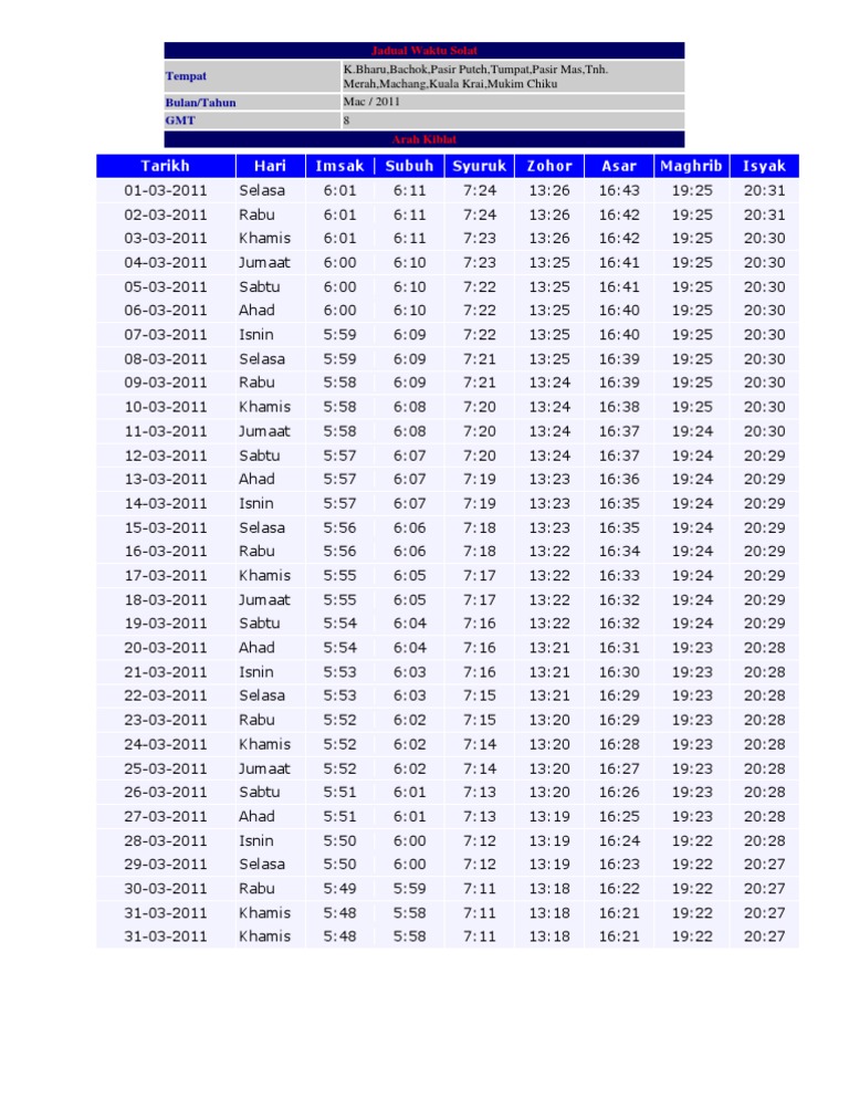 Waktu solat kota bahru bachok pasir puteh tumpat pasir mas tanah merah machang kuala krai dan mukim chiku 2020 imsak. Penyusunan waktu solat fardhu telah diajarkan sendiri oleh malaikat jibrail kepada nabi muhammad s a w. Waktu doa hari ini di kulai akan bermula pada 05 18 matahari terbit dan selesai di 20 02 isyak.